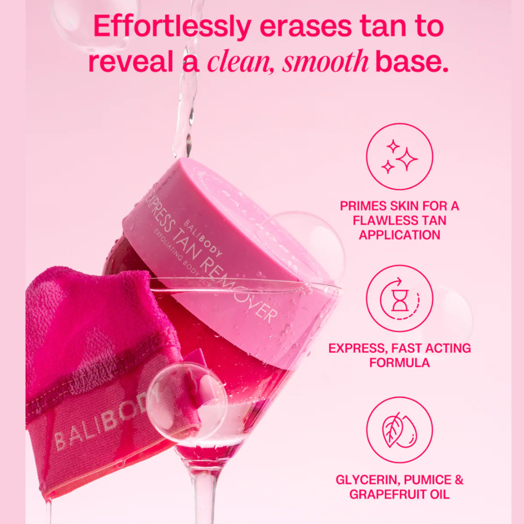 Formulated with a combination of physical and active exfoliants, this remover effortlessly erases tan by breaking down dyes and colour. Your skin will be silky smooth and perfectly primed for a flawless self tan application. For best results, use Express Tan Remover with an Exfoliating Mitt.