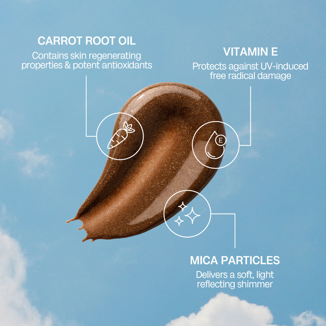 Formulated with SPF15 sun protection and carrot root extract, this lightweight gel stimulates melanin production for a deep, natural sun tan while shielding the skin from UV damage. Bronze shimmering pearls deliver an instant high-gloss finish, while a nourishing blend of antioxidant-rich oils leaves skin soft, smooth and sunkissed. Complete with a light coconut scent that transports you to a tropical escape, it’s your daily go-to for luminous skin in the sun.